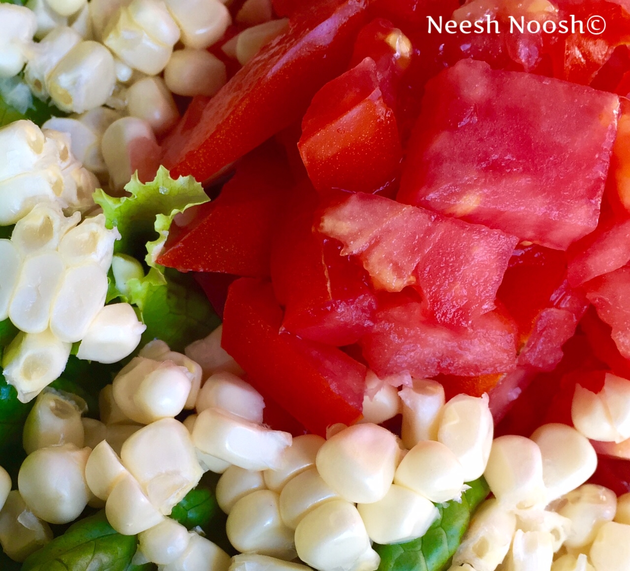 2. Wash tomatoes and remove corn husks. Chop tomatoes finely. Slice corn off of cob (raw corn is delicious!).
