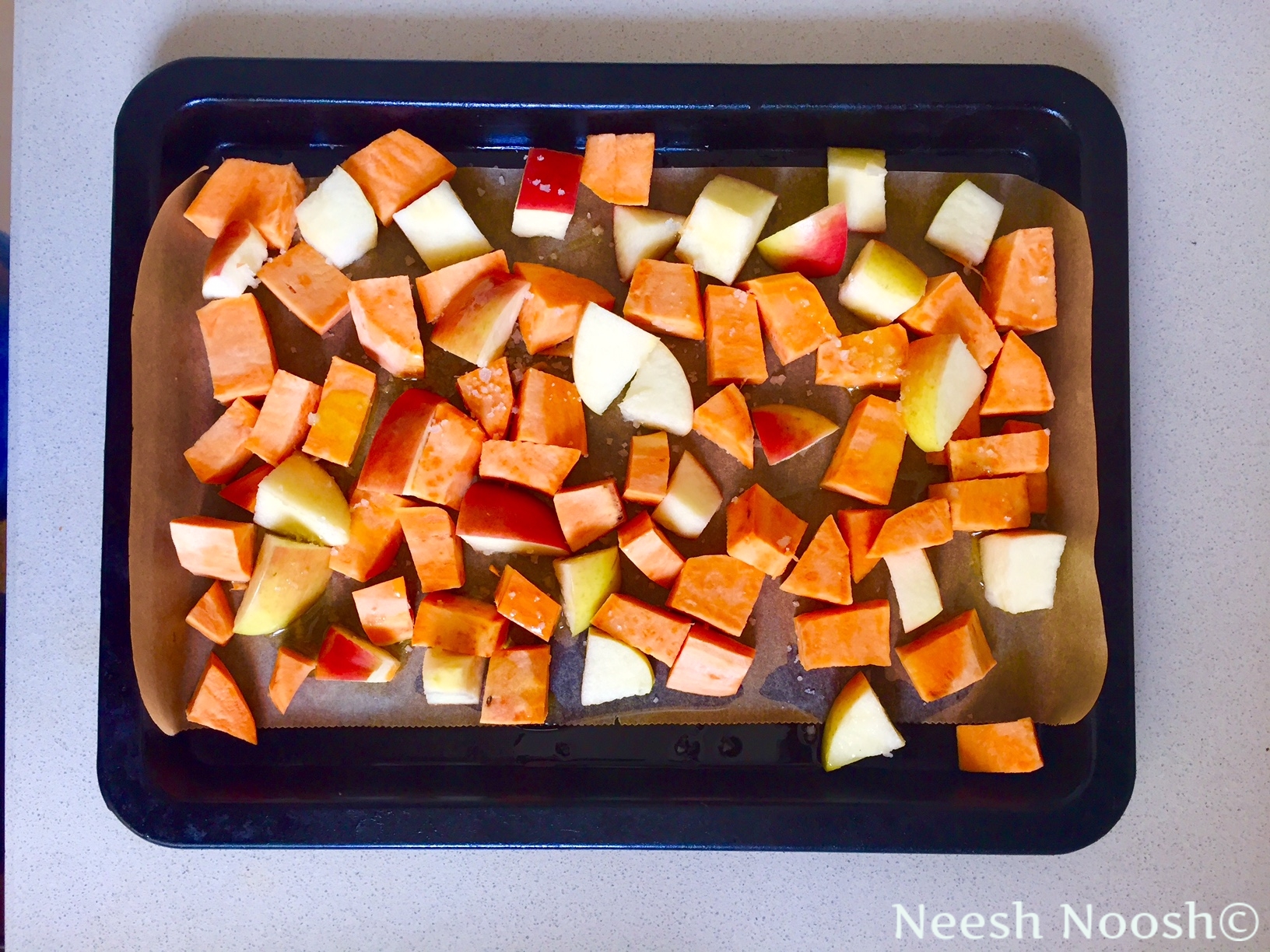 3. Wash apples and yams. Peel yams. Chop into small pieces and arrange on paper lined tray. Drizzle with olive oil and salt. Bake until soft and slight browned, about 40 minutes. When done, remove from oven and let cool slightly.
