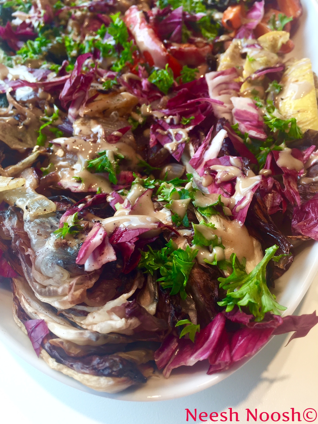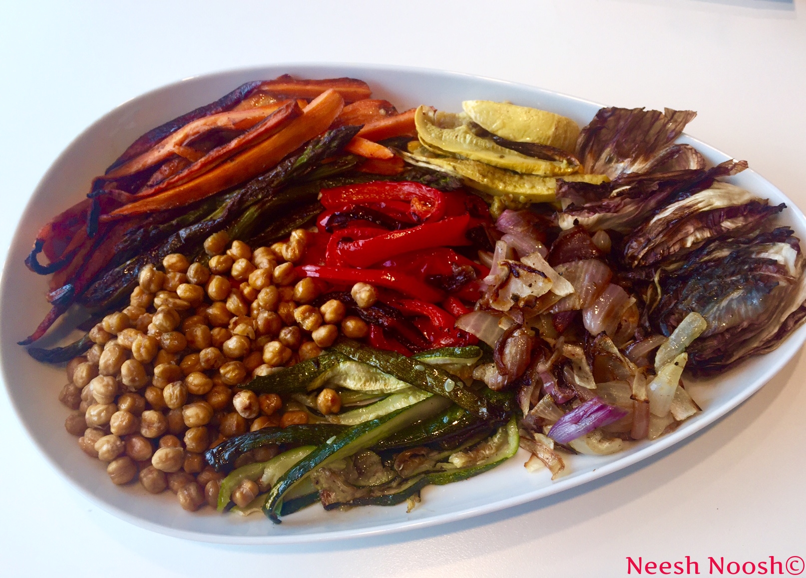 5. While the vegetables and chickpeas are roasting, chop the remaining ½ radicchio. When they’re all done, remove the vegetables and chickpeas from the heat and place on a platter. Arrange by types of vegetables or toss together. Drizzle lightly with olive oil.