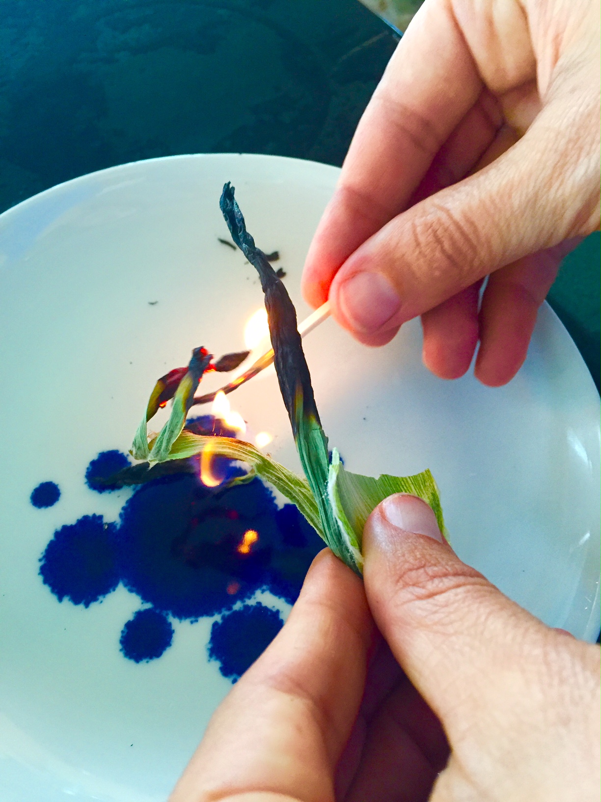 Traditionally the final meal for the Tisha b’Av fast, one would eat an egg and bread dipped in ashes. Using the month’s themes of comfort and nourishment, I wanted to create a recipe the conveys them. I am visiting family in Chicago where fresh summer corn is readily available and delicious. I used the ingredients from the Angelic Organics CSA box, run by the famous Farmer John. I sprinkled a tiny bit of corn husk ash on each bowl of soup, as a reminder of the ash eaten before Tisha b’Av. The recipe is adapted from one I found on the Minimalist Baker.