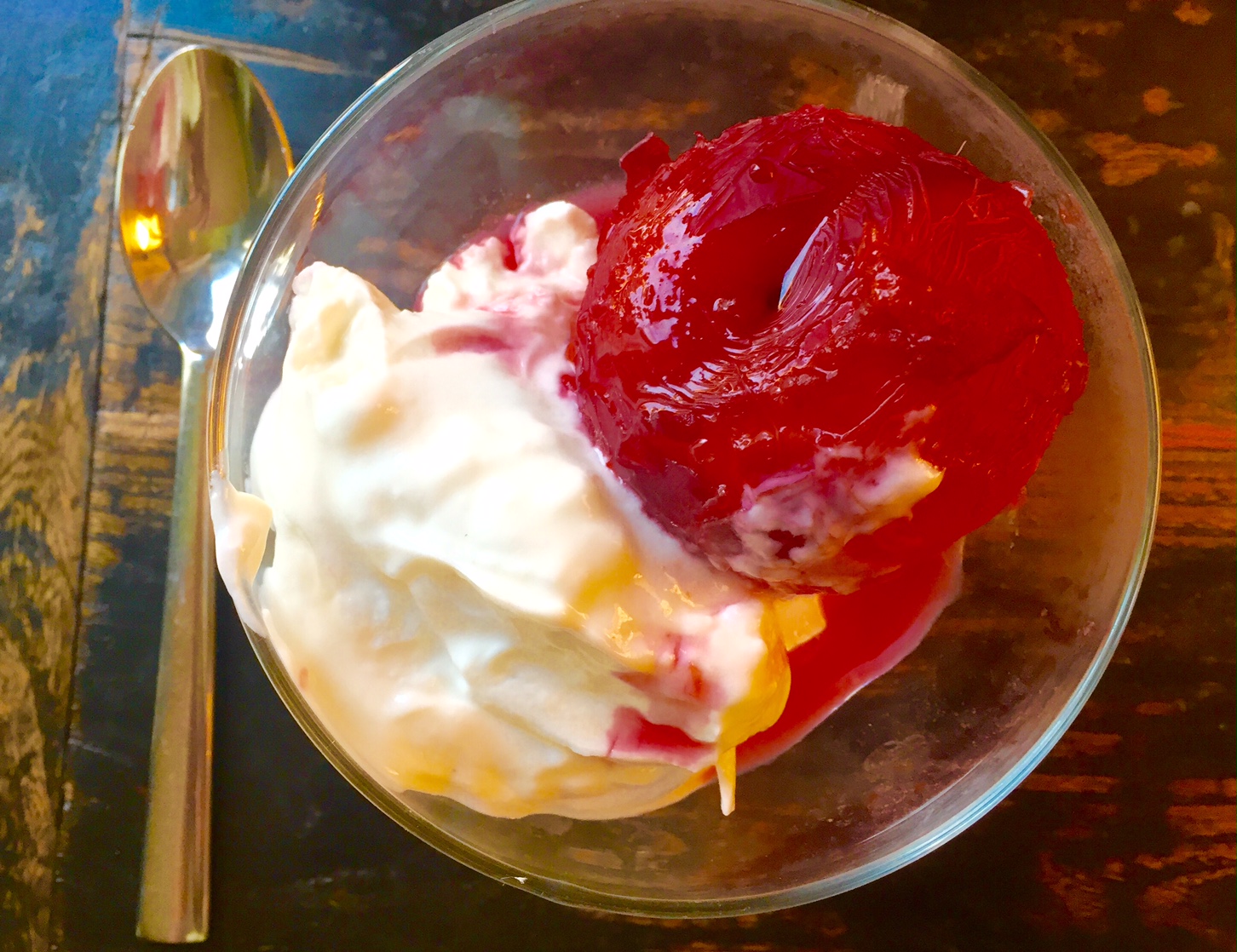 2. Perfect timing- I just returned from market with half a dozen plums.Actually hard to find really bright red, juicy tasty organic plums so this recipe is a teshuva opportunity to overcome the faults of this seasons plums by poaching them. Even after 8 min they needed more poaching and I naughtily doubled the sugar, used the richest vanilla ice cream made from buttermilk and just before serving added a vanilla liquor flambé to bring the fiery intensity of Elul. It looked fabulous, tasted great and after 2 min the fire alarm stopped. Be cautious if you have long wavy hair or long eyelashes.