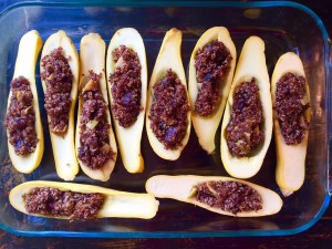 This is a recipe that I originally wrote for the Borough Market blog and wanted to share with you. Enjoying seasonal foods at meals in a sukkah makes Sukkot the ultimate “farm to table” holiday. The holiday foods are frequently stuffed, to symbolize the harvest bounty. The dish I prepared is quinoa stuffed zucchinis, sweetened with dates, figs and honey, a few of the “seven species” of Israel.