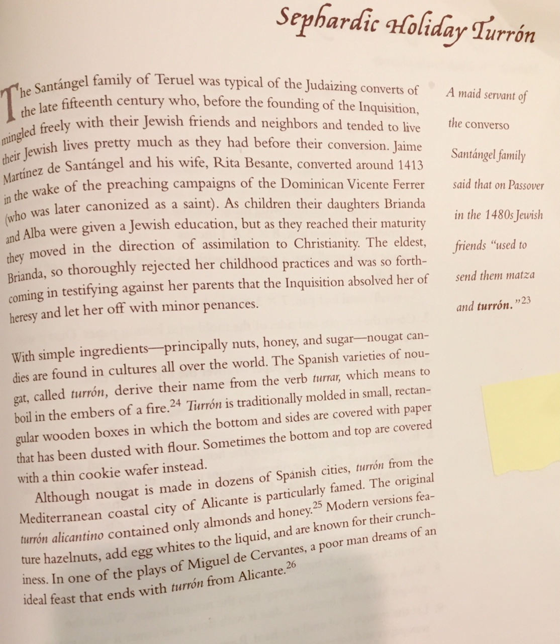 One food that I repeatedly saw all over this area (on both sides of the border) was turron. I then learned that it was a common food amongst Jews in medieval Spain. The cookbook, A Drizzle of Honey: The Lives and Recipes of Spain’s Secret Jews, that I wrote about before, includes a recipe with a story that a Jewish family would send matzah and turron as a gift at Passover. The turron I saw in France and Spain were of every shape, form and filling-some more smooth, like nougat, and a mono-shade of orange or light brown, while others were more brittle and filled with dried fruits and nuts.