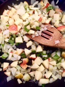 - Over medium heat in a large pan, add about 1 tbsp olive oil. Add onion and fennel and cook until they start to soften. Add apple, garlic and sage. Mix well and continue to cook over low/medium heat for about 10 minutes until they are soft. Add vegetable broth as needed to prevent the ingredients from sticking or burning.