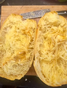 - Pre-heat oven to 350 degrees. Poke holes in the squash and bake until soft, approximately 35 minutes. When it is finished, remove from heat and let cool.