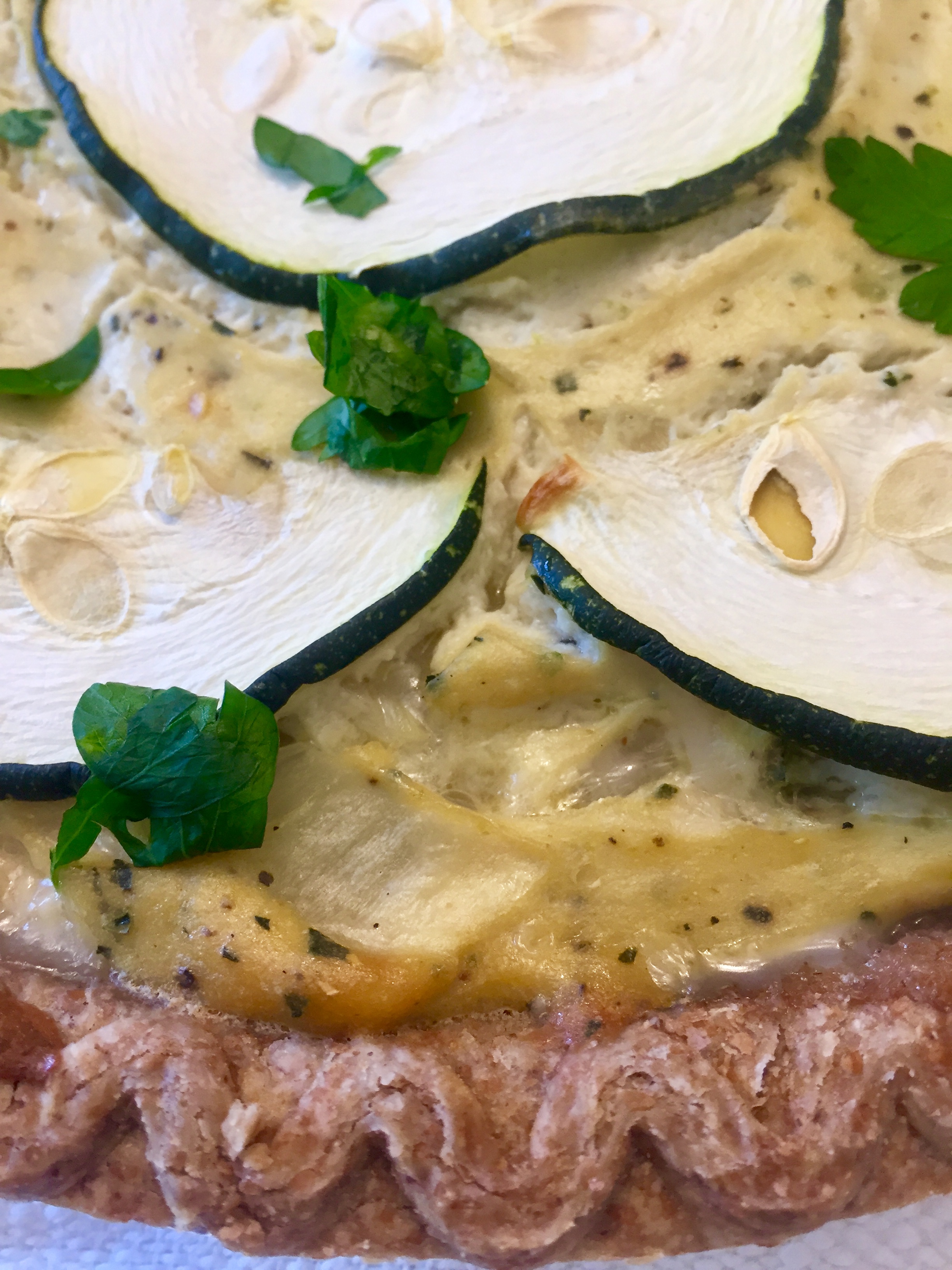 The foods of Simchat Torah usually elongated to represent the Torah scrolls or round to represent hakafot–the circles one dances in to celebrate the holiday. This year, I prepared a vegan zucchini quiche with lots of circles. It’s a great way to use up the season’s last bits of zucchini and is easy to prepare. There are many zucchini varieties and it would be interesting to try an assortment in this dish. Though, I perhaps should have made a dish with the super popular spiralized zucchini!