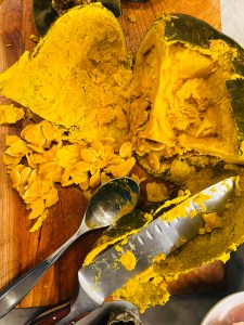 4. When the squash is “al dente” remove from the oven, slice open and take out the seeds. Put large chunks of the squash (without the skin) into the soup. The squash will continue to cook with the soup and start to break apart but try to keep small chunks.Add more broth as needed so that it’s not too much of a stew. Add paprika and cinnamon. Add salt and pepper to taste.
