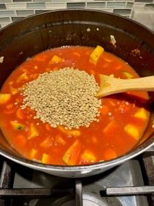 5. Add tomatoes, broth, lentils, spices, salt and pepper. Mix well. Bring to a boil and then simmer until the squash and lentils are thoroughly cooked, approximately 30 minutes. Most of the liquid will evaporate but add more water or broth if you want a more soup, not stew, consistency. Add additional spices as needed (ie spicier or sweeter)