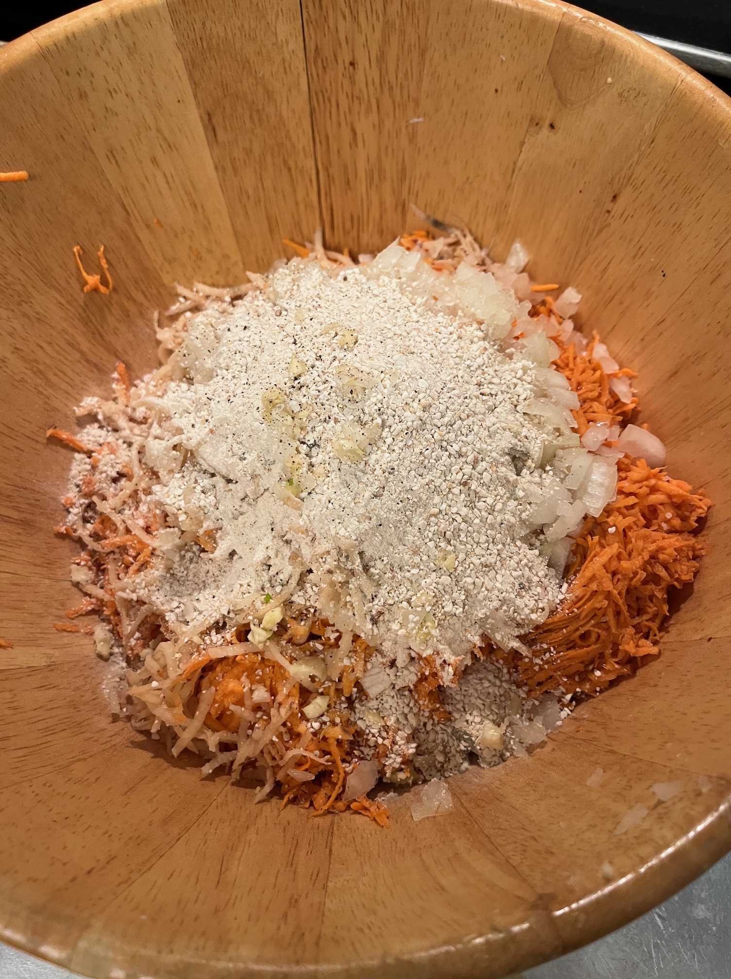 - Wash the potato and shred separately from the sweet potatoes. Squeeze as much excess water as possible. Add to the sweet potato mixture.