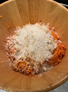 - Wash and peel (I left part of the skin on because it’s nutritious) the sweet and shred them (I used a Cuisinart which makes it a much quicker process). Add to a large mixing bowl.