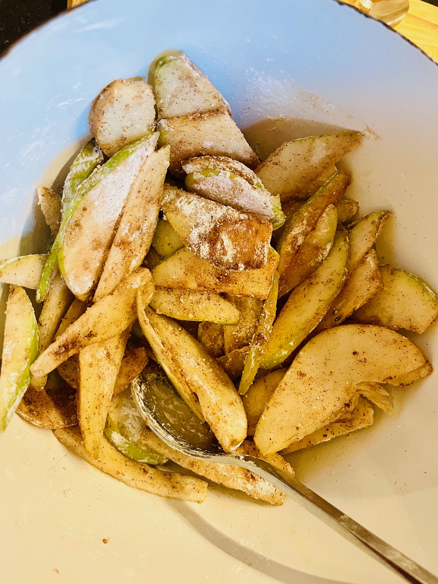 - Put the pears in a bowl. Add the vanilla, cinnamon, cardamom, cloves, sugar and corn starch. Mix well.