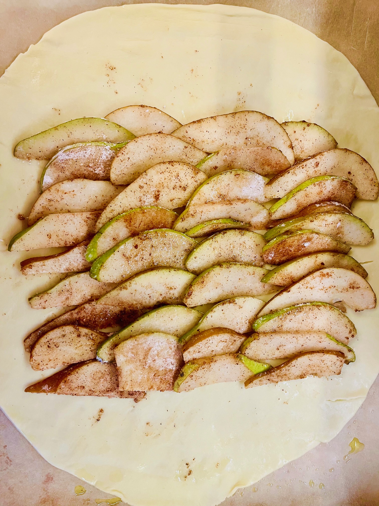 - Take a large cookie sheet and cover with parchment paper. Place the dough on it. Some pie doughs might be round, but you can gently stretch it into a more square shape. Place the pear slices in the middle, slightly overlapping each other. Leave about one inch along all four sides. Once you finish placing the pear on the dough, gently bring the edges of the dough towards the center, covering the edge pieces of pear. Pinch the corner dough together. It doesn’t have to be event and I like the imperfect look of galettes.