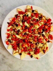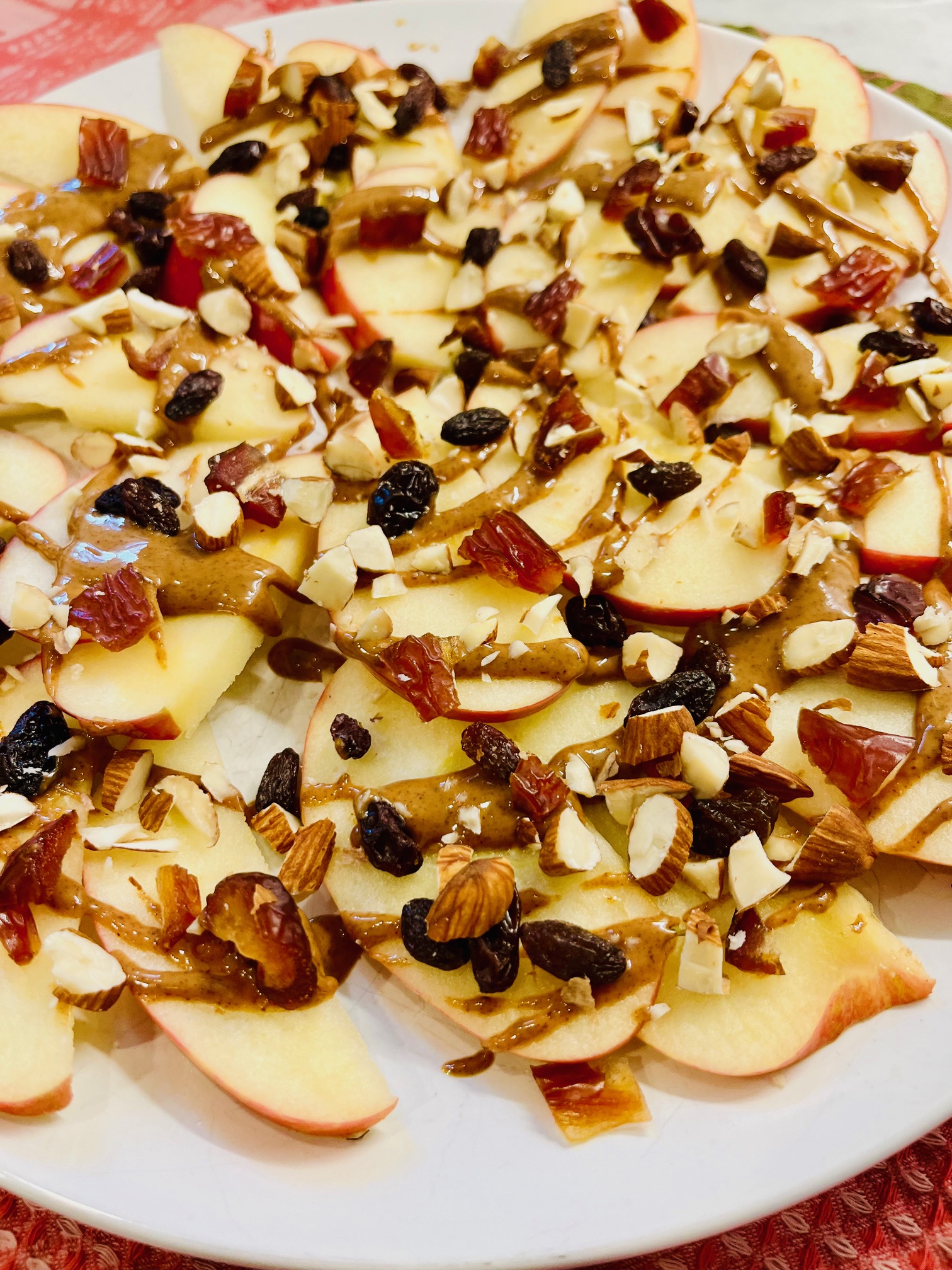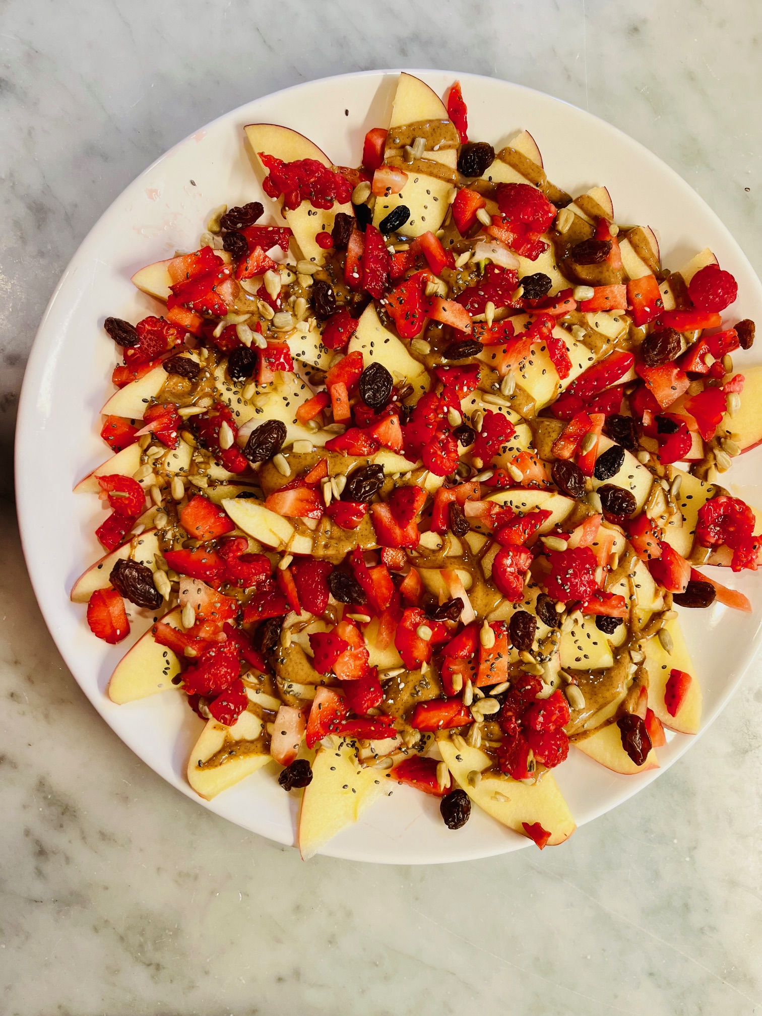 PS: Here’s another “Apple Nachos dish” with chopped strawberries, sunflower seeds, chia seeds, raisins.