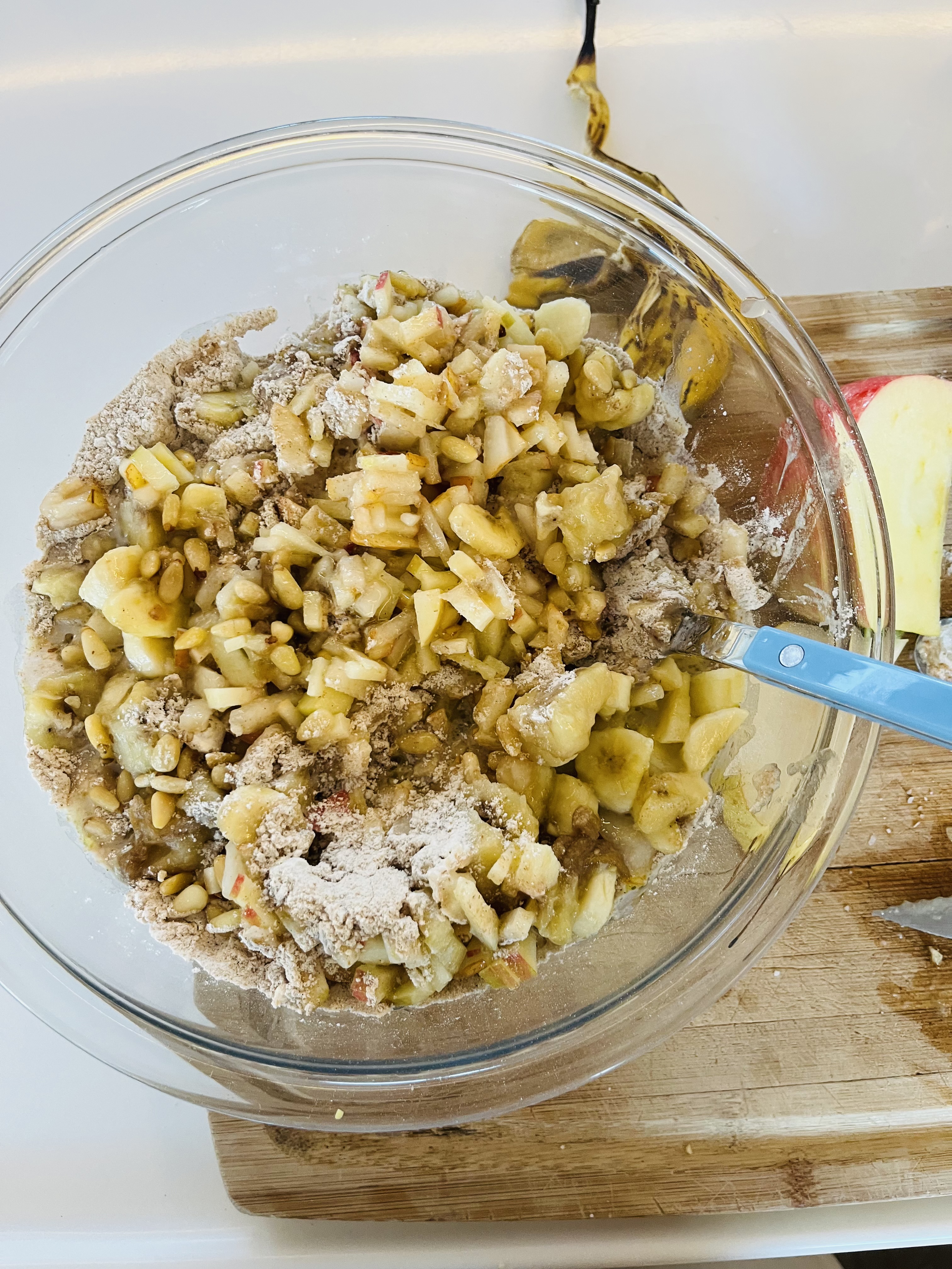 2 cups finely chopped pear and apple. I used 3/4 of a Bosch pear and about half of a Honey Crisp apple.
